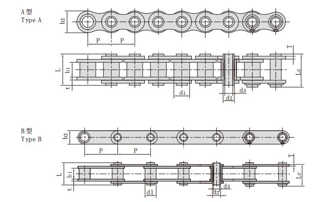 鏈號 節(jié)距 套筒直徑 內(nèi)節(jié)內(nèi)寬 銷軸直徑 銷軸長度 內(nèi)鏈板高度 鏈板厚度 破斷載荷 每米長重 型號
