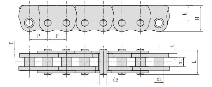 鏈號(hào) 節(jié)距 套筒直徑 內(nèi)節(jié)內(nèi)寬 銷軸直徑 銷軸長度 鏈板尺寸 抗拉強(qiáng)度