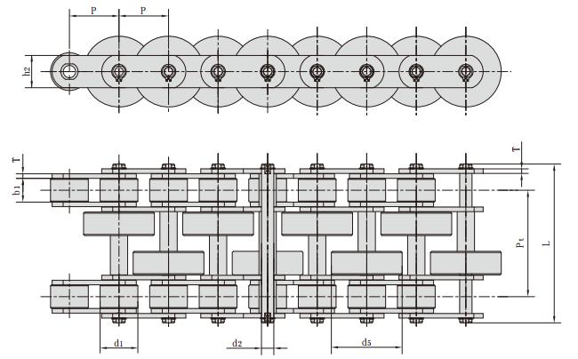 鏈號 節(jié)距 滾子直徑 內(nèi)節(jié)內(nèi)寬 銷軸直徑 銷軸長度 鏈板高度 鏈板厚度 排距 抗拉強度 每米長重