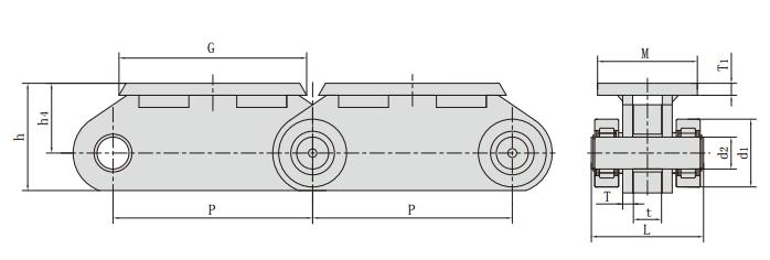 鏈號(hào) 節(jié)距 滾子直徑 銷軸直徑 銷軸長(zhǎng)度 鏈板厚度 附件尺寸 抗拉強(qiáng)度