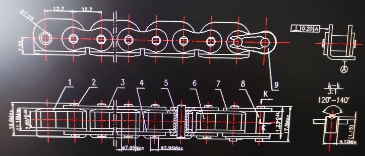 SD08AF1熱合機(jī)鏈條主要應(yīng)用于熱合機(jī)設(shè)備上,通過鏈條頂部附件實(shí)現(xiàn)對(duì)接,熱合封口機(jī)工作流程:袋口清潔集塵(備選)→縫包機(jī):外袋縫包→切刀斷線:修整袋口→熱熔膠帶(3.4.6組加熱塊加熱)→彈性壓輥壓合→完成