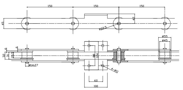 輸送鏈條,節(jié)距為150mm,帶托板附件,滾軸為F輪,應(yīng)用于多種輸送設(shè)備上,上圖主要為輪轂輸送線