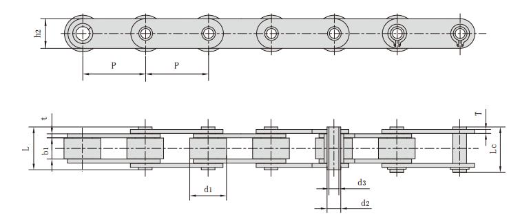 餅干輸送線,糕點(diǎn)輸送線,食品機(jī)械輸送線,主要選用不銹鋼雙節(jié)距空心銷軸鏈為主,圖中選用型號(hào)為C2042HPSS,中間連接桿總長度為640mm,連接桿直徑8mm,鏈條主要規(guī)格參數(shù)見下圖:
