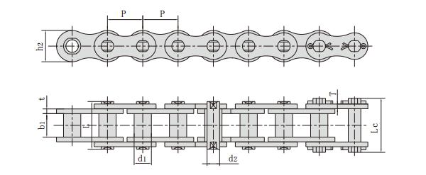 套筒鏈主要型號(hào)有:節(jié)距,套筒直徑,內(nèi)節(jié)內(nèi)寬,銷軸直徑,銷軸長度,鏈板高度,鏈板厚度,抗拉強(qiáng)度,每米長重