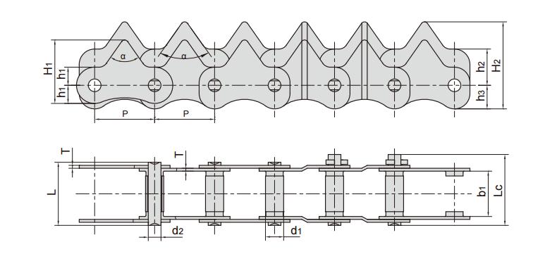 鏈號(hào) 節(jié)距 滾子直徑 內(nèi)節(jié)內(nèi)寬 銷軸直徑 銷軸長(zhǎng)度 齒形角 鏈板厚度 鏈板尺寸 抗拉強(qiáng)度 平均抗拉強(qiáng)度