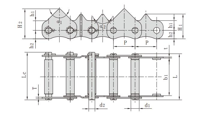 鏈號 節(jié)距 滾子直徑 內(nèi)節(jié)內(nèi)寬 銷軸直徑 銷軸長度 齒形角 鏈板厚度 鏈板尺寸 抗拉強度 平均抗拉強度