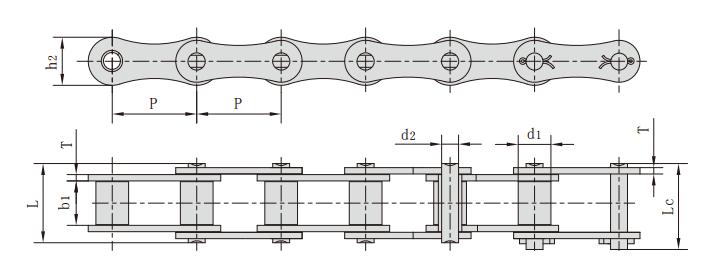 鏈號 節(jié)距 滾子直徑 內(nèi)節(jié)內(nèi)寬 銷軸直徑 銷軸長度 鏈板尺寸 抗拉強(qiáng)度 每米長重