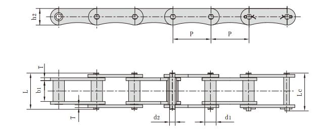 鏈號 節(jié)距 滾子直徑 內節(jié)內寬 銷軸直徑 銷軸長度 鏈板高度 鏈板厚度 抗拉強度 每米長重