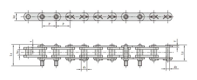 鏈號 節(jié)距 套筒直徑 內(nèi)節(jié)內(nèi)寬 銷軸直徑 銷軸長度 鏈板高度 鏈板厚度 抗拉強度 平均抗拉強度 每米長重