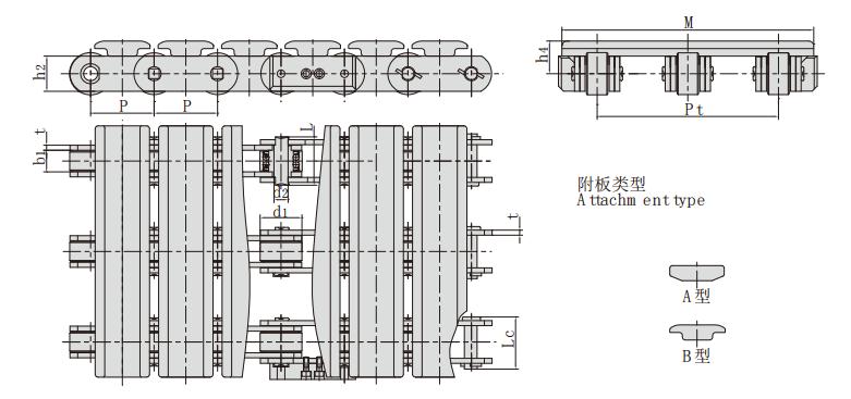 鏈號 節(jié)距 滾子直徑 內(nèi)節(jié)內(nèi)寬 銷軸直徑 銷軸長度 鏈板高度 鏈板厚度 附板尺寸 抗拉強度 附板類型